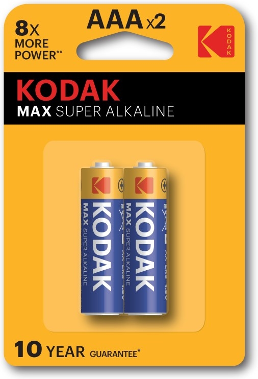 Комплект из 2 штук щелочных (Alkaline) батареек Kodak типоразмера LR03 (AAA) серии MAX SUPER: щелочной состав обеспечивает длительный срок службы и высокую производительность. Используйте для питания пультов, игрушек и других низкопотребляющих устройств.