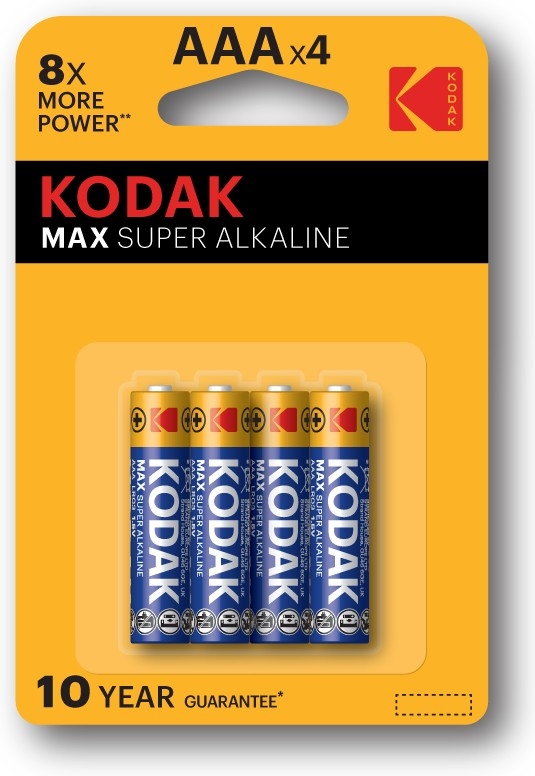 Комплект из 4 штук щелочных (Alkaline) батареек Kodak типоразмера LR03 (AAA) серии MAX SUPER: это надежный источник энергии, который сохраняет заряд до 10 лет. Отлично подходит для устройств с умеренным потреблением энергии, таких как беспроводные мыши и клавиатуры.