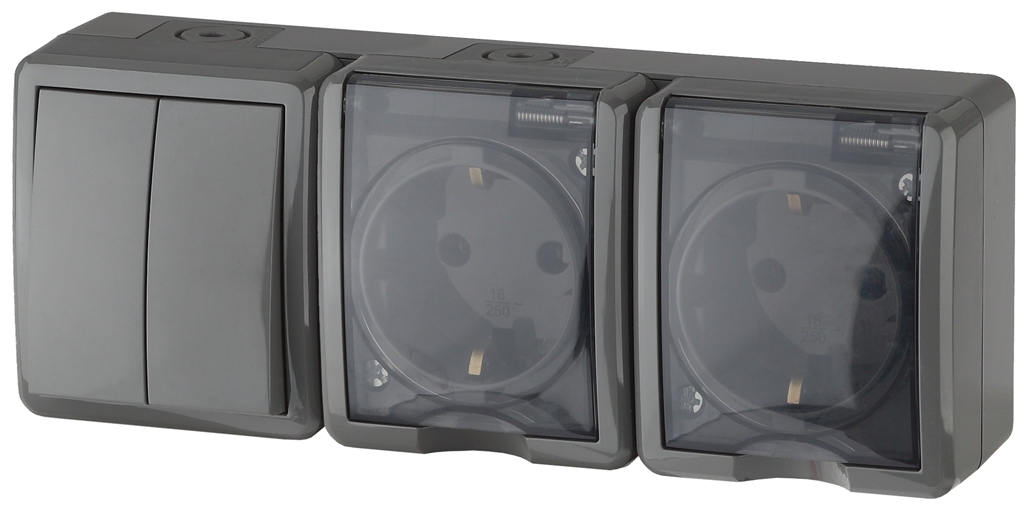 Блок две розетки+выключатель двойной ЭРА IP54 16АХ(10AX)-250В ОУ серый /5 11-7404-03