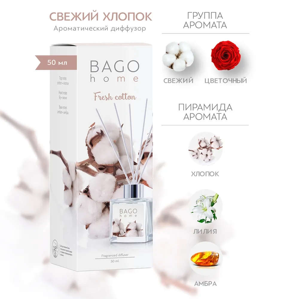 Сочетание свежего с цветочным ароматом. Ароматический диффузор «Свежий Хлопок» от BAGO home наполнит ваш дом свежим, но при этом сладким цветочным ароматом.