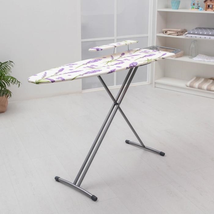 Модель с расширенной комплектацией включает подрукавник для удобства глажки узких деталей, встроенную розетку для подключения утюга и удлинитель для электропитания. Основание из фанеры обеспечивает устойчивость и долговечность. Размер 122х35 см оптимален для глажки постельного белья и одежды. Компактная конструкция позволяет легко хранить доску в сложенном виде.