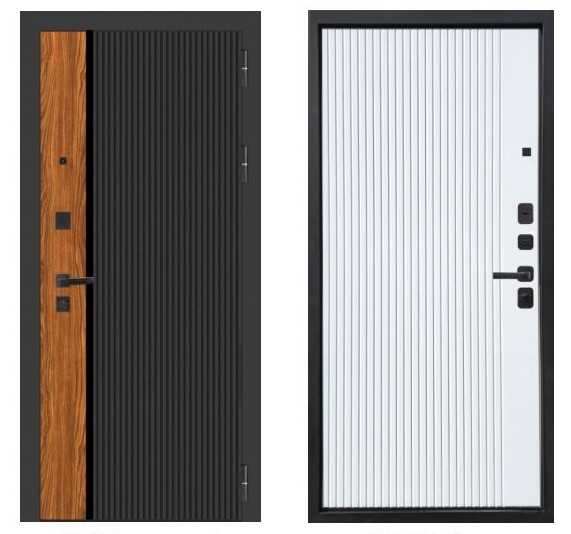 Отделка: 10 мм фрезерованная панель МДФ, Черная шагрень, вставка Орех каньон коньяк, окраска Муар черный / 10 мм фрезерованная панель МДФ,