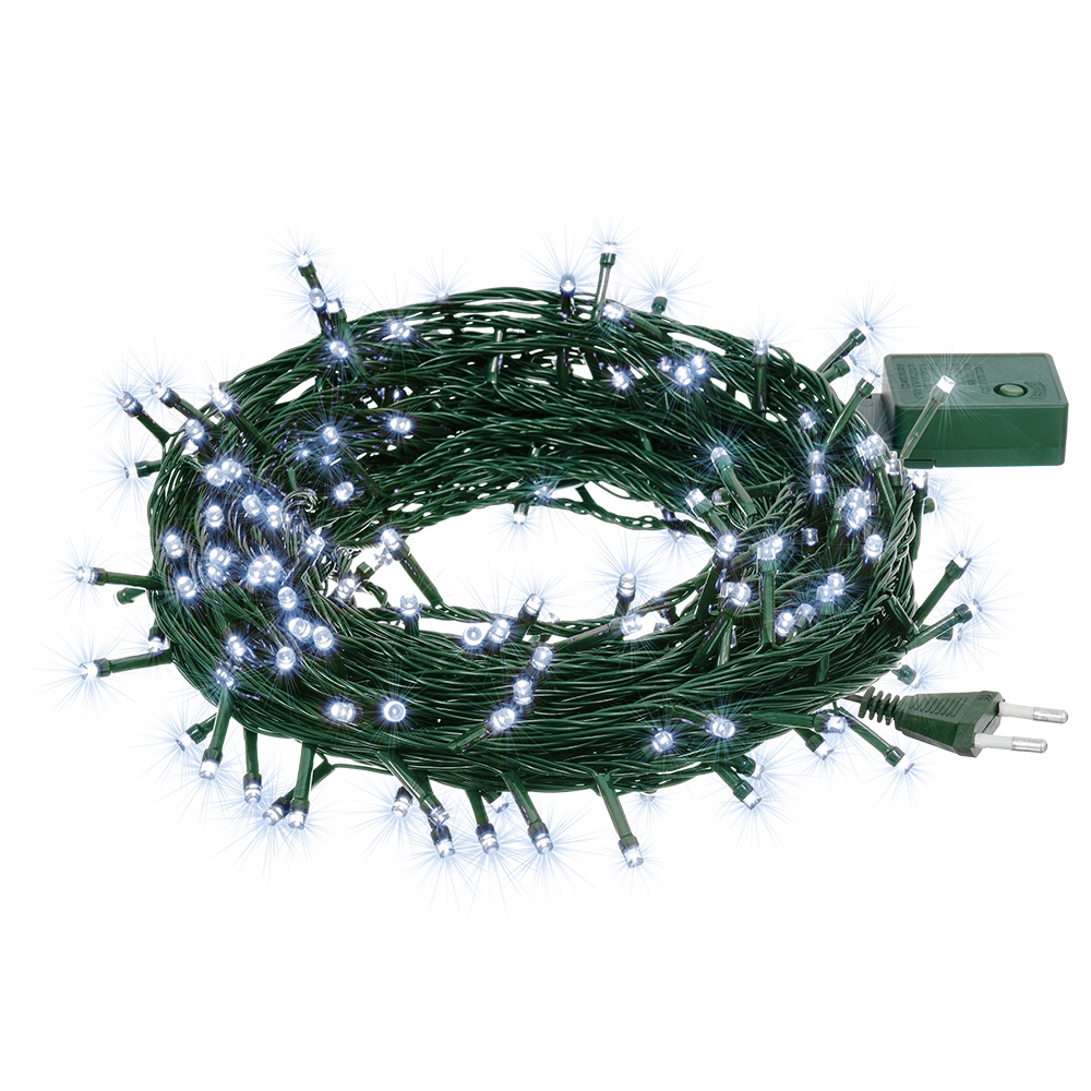 Описание: Длина гирлянды 10 м, длина провода 3 м, количество светодиодов 100. Цвет свечения холодный, цвет провода зеленый. Степень защиты IP 20. Мощность 6 W. Гирлянда имеет контроллер (8 режимов работы). Использовать при комнатной температуре. Срок службы 25 000 часов.