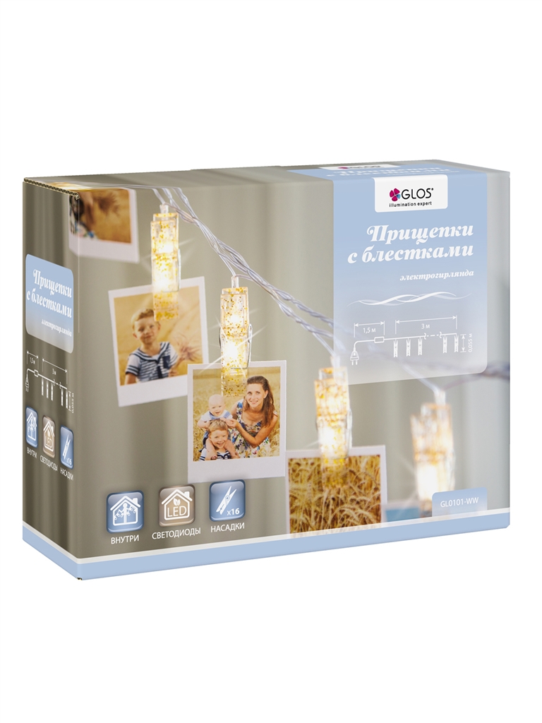 Электрогирлянда ˮПрищепки с блесткамиˮ, 3 м, 16 теплых белых светодиодов с насадками, для испол. вну