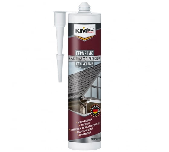 Каучуковый герметик KIM TEC кровля, фасад, водосток, бесцветный, 310 мл предназначен для герметизации и реконструкции швов и зазоров различных стройматериалов (черепица, металл, бетон, древесина, пластик, кирпич, стекло).