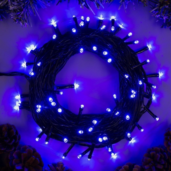 Нить: Тёмный провод (обычно зеленый или черный). Он делает гирлянду менее заметной на темных поверхностях или ветках елки, что позволяет синему свету выглядеть более насыщенным.