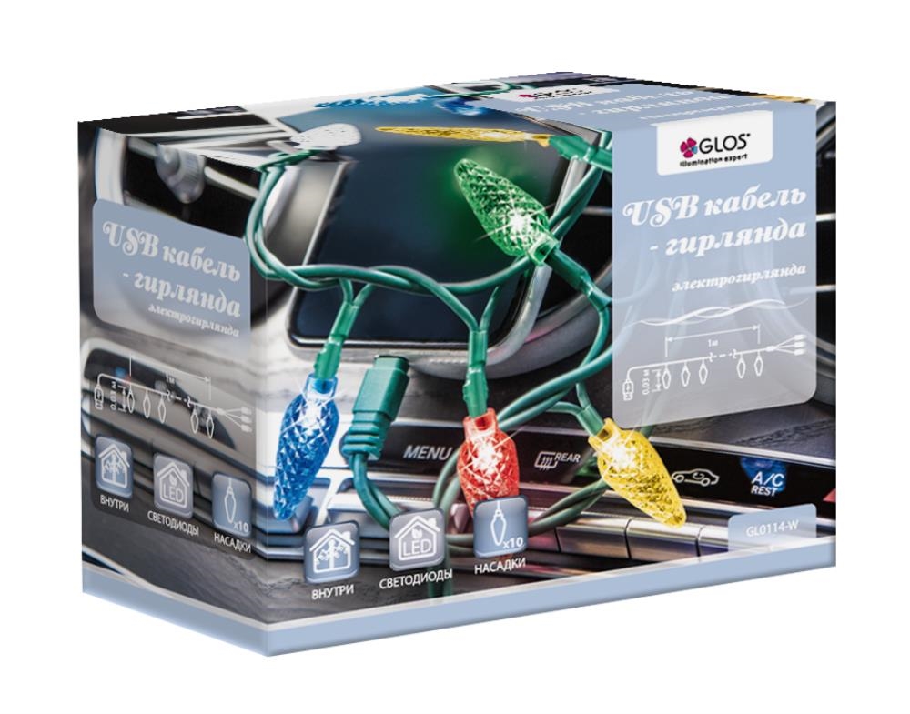 Гирлянда нить 10 миниламп с разноцветными насадками с питанием от USB холодный белый 1м АС