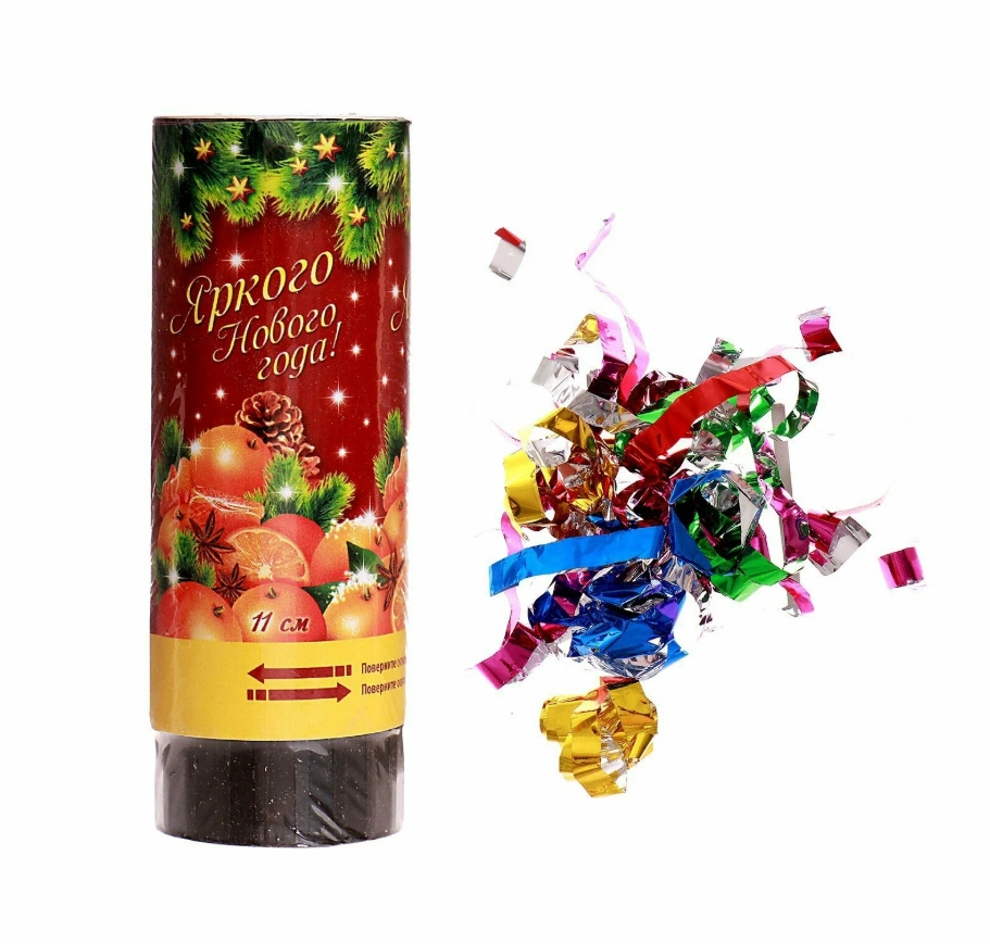 Весёлая хлопушка «Яркого Нового года!» создаст эффектный момент на вашем празднике. Безопасная и яркая - идеальный элемент новогоднего веселья. Компактные и яркие. Отлично подходят для детских праздников и создания веселой кутерьмы. Поворотный механизм некоторых моделей делает их использование еще удобнее. Размер 11 см.