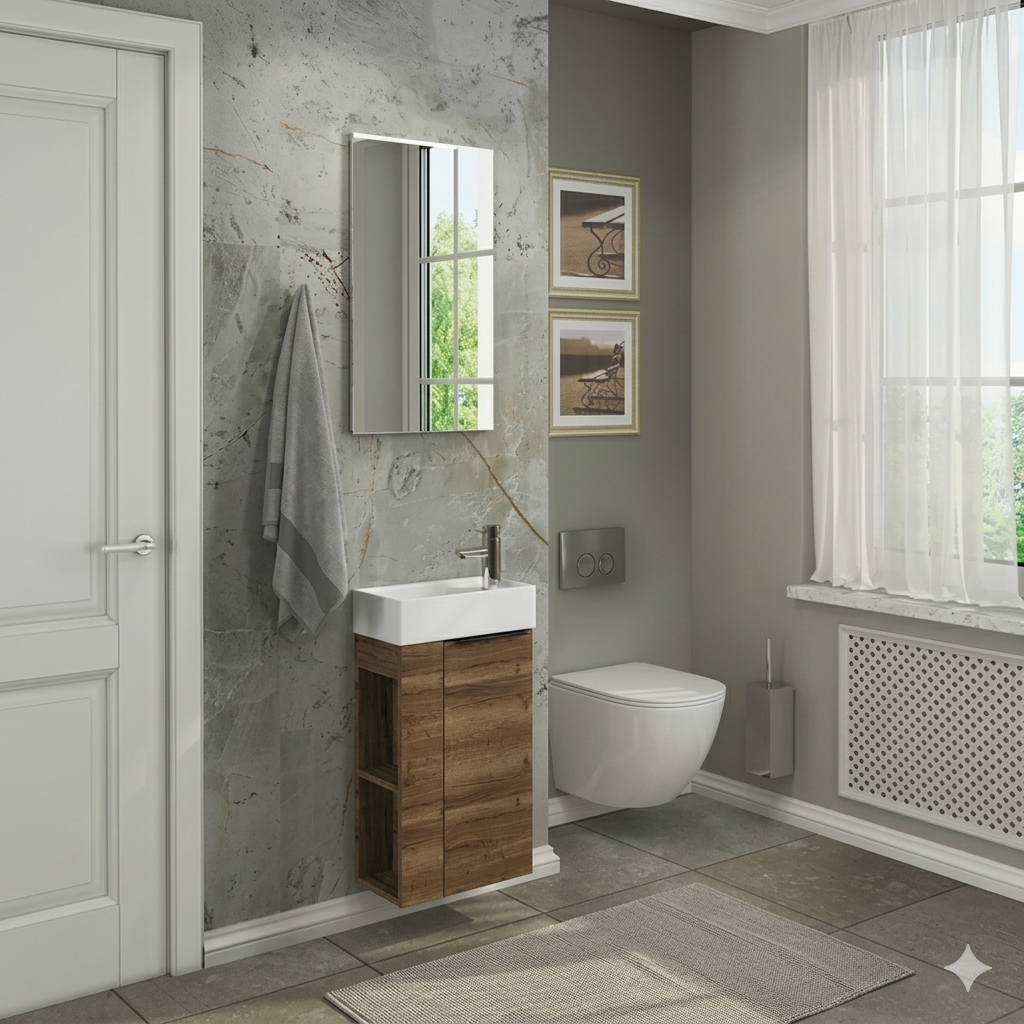 Комплект мебели COMFORTY модели «Матэ-40» в темно-коричневом цвете представляет собой готовое решение для обустройства ванной комнаты и включает тумбу, раковину Crea-40, зеркало и светильник. Благодаря продуманной конструкции и компактным размерам комплект органично вписывается в небольшие помещения, обеспечивая удобное хранение вещей и функциональность каждой детали. Элегантное темно-коричневое исполнение придает интерьеру благородный и стильный вид, а входящий в набор светильник создает комфортное освещение рабочей зоны.