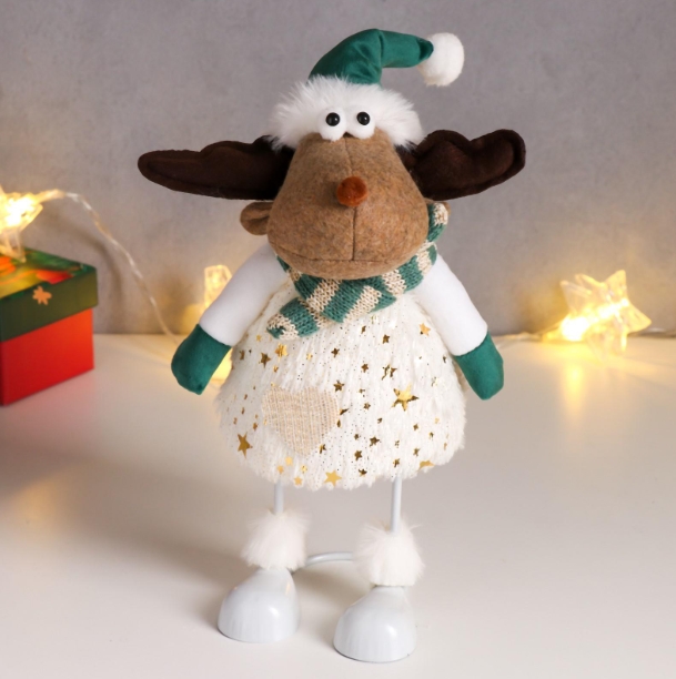 Кукла интерьерная текстильная Лосик в зелёном колпаке, и белом наряде с золотыми узор., 30×10×14 см станет оригинальным элементом новогоднего декора. Его уютный образ подарит радость детям и взрослым.