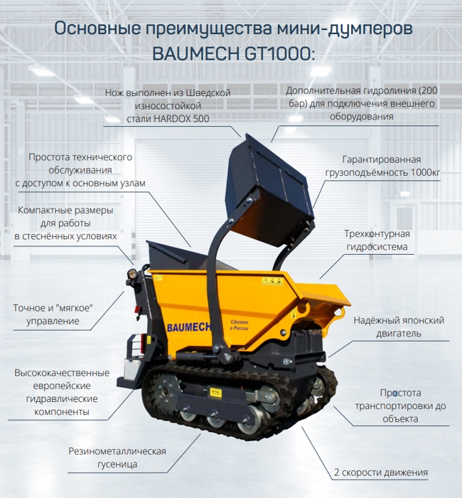 Номинальная грузоподъёмность в 1000 кг, позволяет с лёгкостью перевозить материалы с высокой плотностью, такие как ПГС, цемент, раствор бетона и другие.Основные возможности наших думперовСистема самозагрузки мини-думпера - значительно экономит время при работе, загрузка полного кузова происходит за 25 секунд!Двухскоростная гидравлическая трансмиссия обеспечивает максимальное усилие и плавность на первой передаче и максимальную скорость 6 км/ч с полной загрузкой на второй передаче.