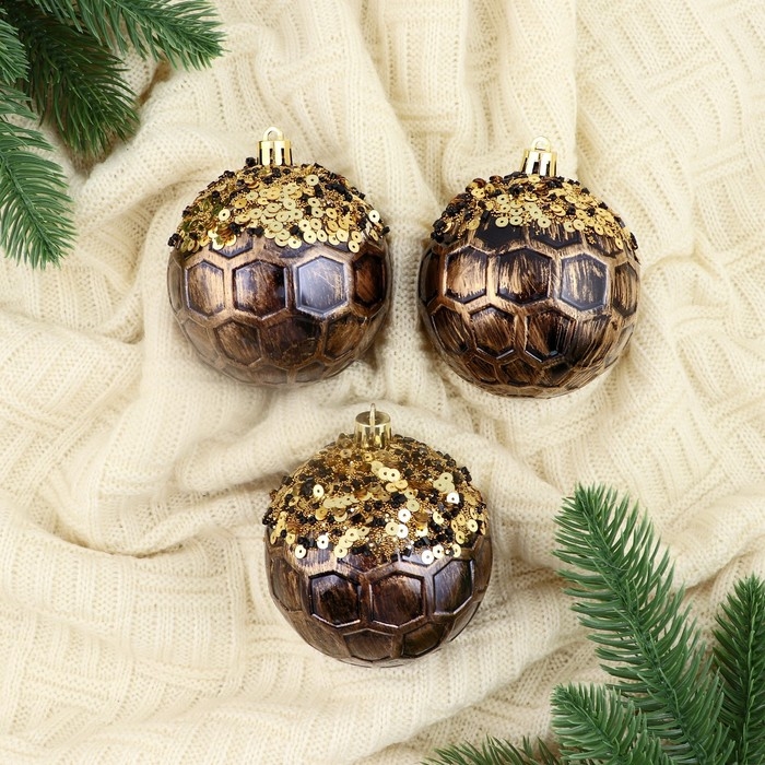 Набор шаров пластик d-8 см, 3 шт ˮСказочные узорыˮ снежинки, золотисто-коричневый