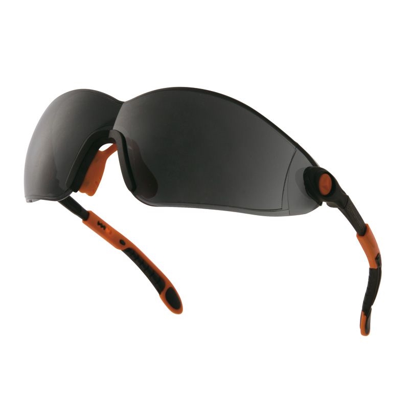 Очки из монолитного дымчатого поликарбоната. Регулируемые по длине и углу наклона дужки из нейлона, с плоским окончанием. Интегрированное переносье из ПВХ. Боковая защита.