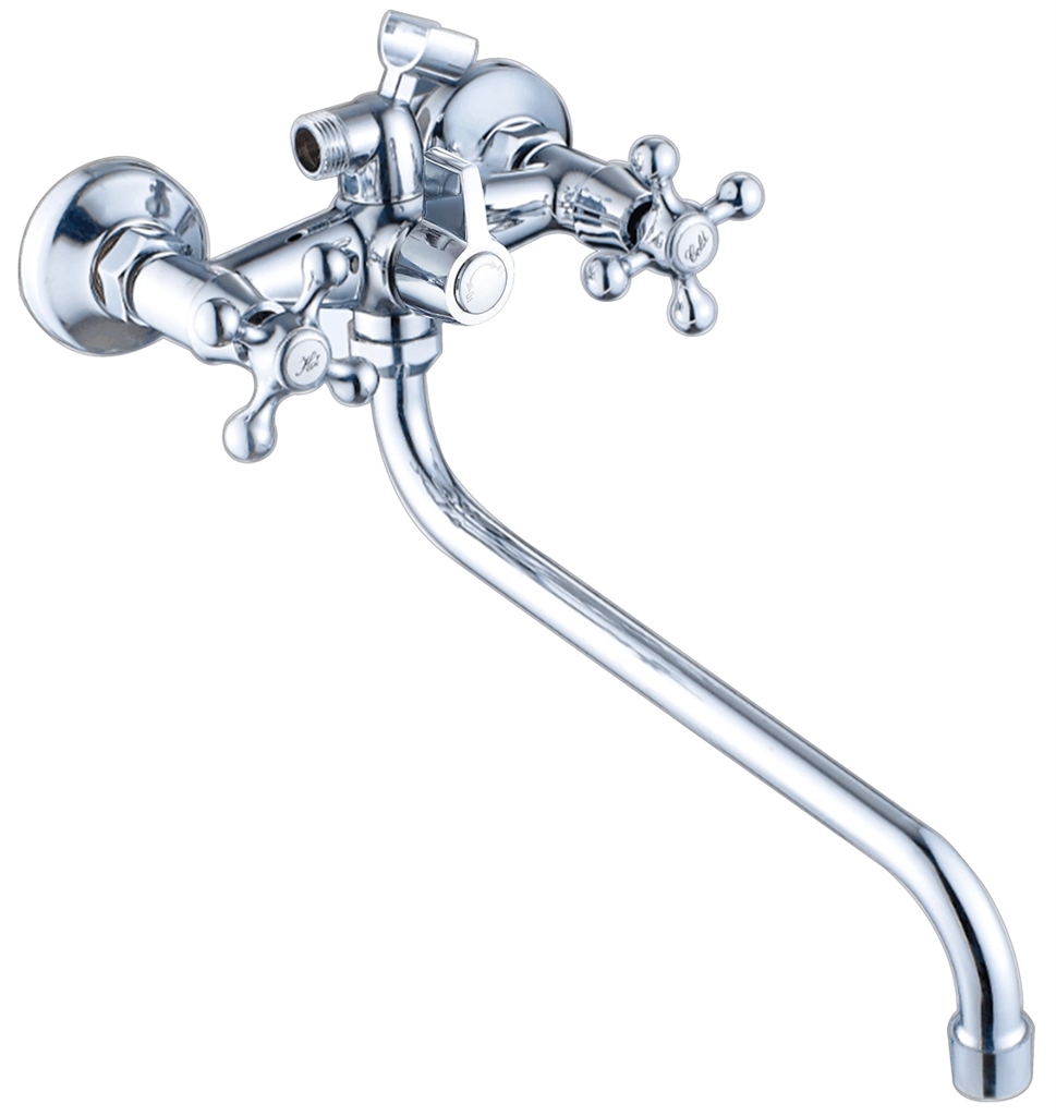 Двухзахватный (двухвентильный) смеситель MAXONOR для ванны с длинным изливом и хромированным покрытием: классическая двухвентильная система позволяет точно настроить температуру и напор воды. Применяется для традиционной установки в ванной комнате.