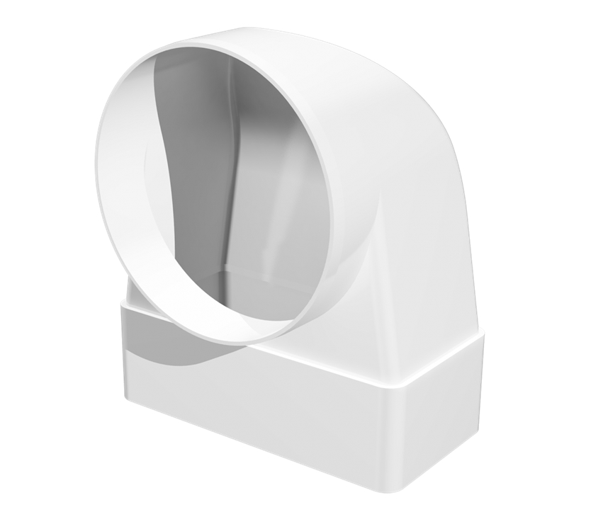 Применяется для соединения плоских воздуховодов сечением 55х110 мм с круглыми воздуховодами диаметром 100 мм под углом 90 градусов