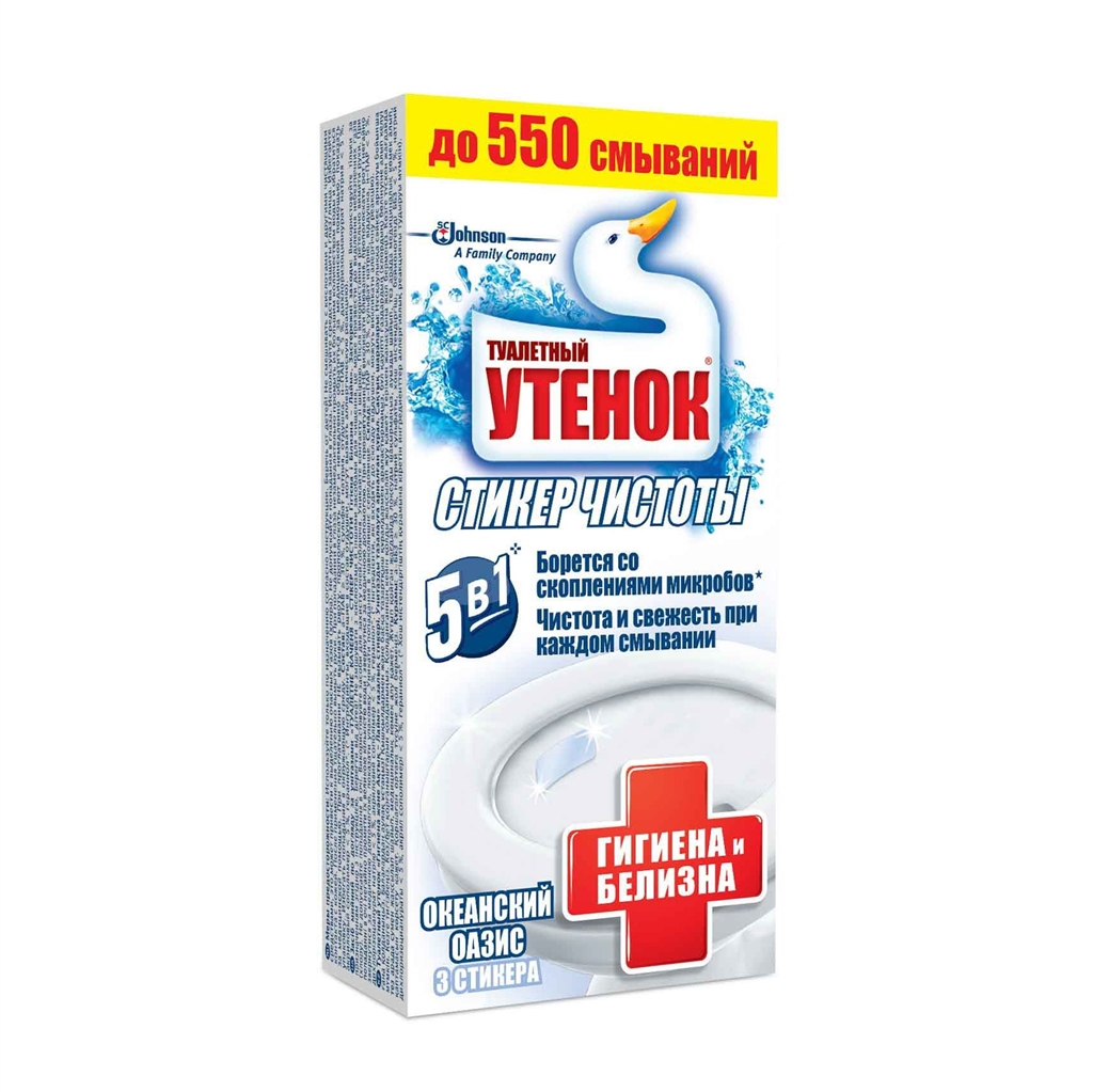 Не нужно прикасаться к грязным блокам унитаза. Прост и легок в использовании. Постепенно растворяется в воде, обеспечивая чистоту и свежесть при каждом смывании: 3 стикера хватает до 3 недель (550 смываний). Отсутствие корпуса не дает скапливаться бактериям. Линейка ''Гигиена и Белизна'' содержит компонент Мирапол, который борется с очагами скопления бактерий и известковым налетом, и отбеливающий компонент - активный хлор.