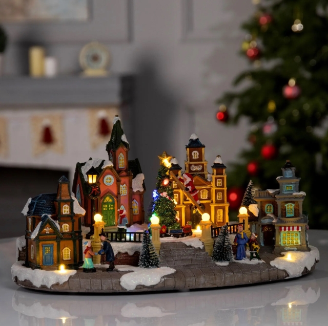 Светодиодная фигура «Рождественская площадь» (40×21×22 см) из полистоуна. Масштабная композиция с подсветкой, которая питается от 3 батареек типа АА или USB. Эта фигура станет центром внимания в вашем праздничном интерьере.