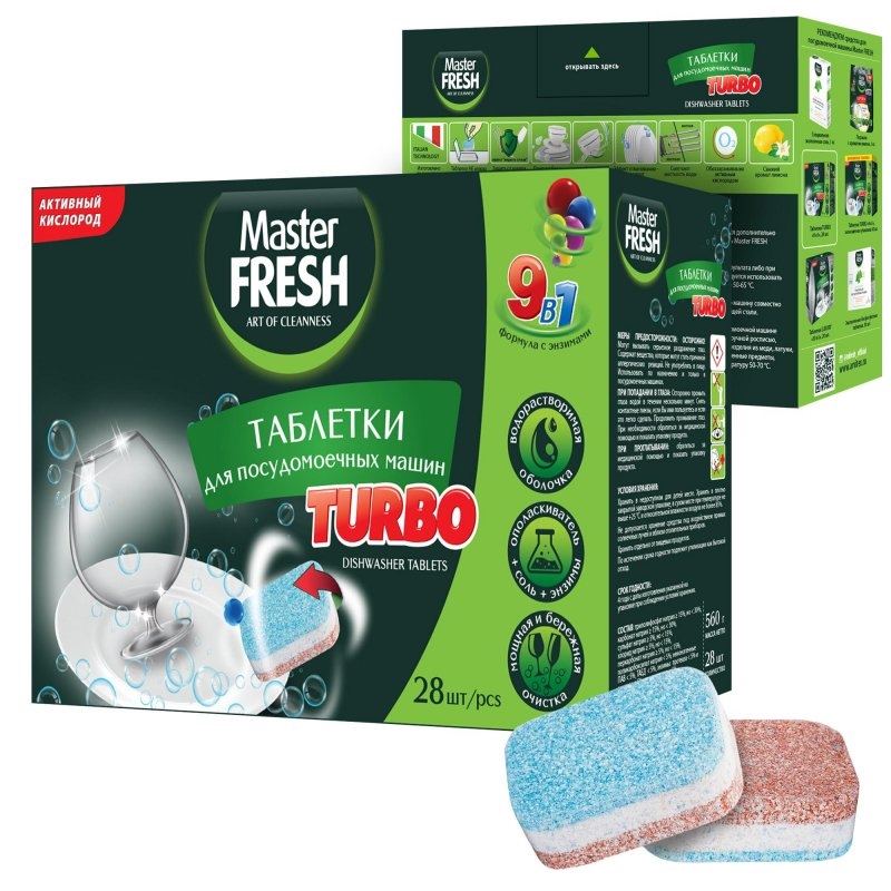 Таблетки для П/М Машины МАСТЕР ФРЕШ *28шт. TURBO /9в1/в раст. обол.