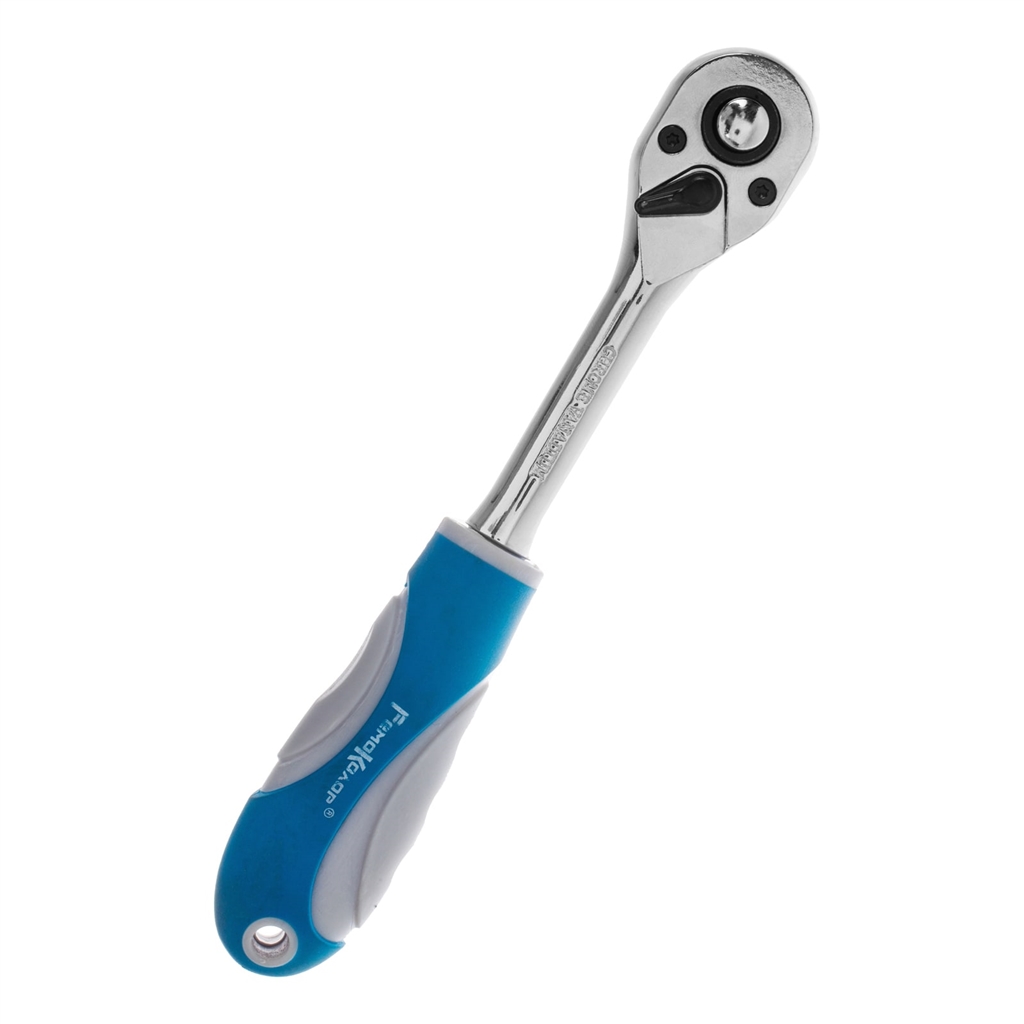 Материал хромованадиевая сталь, двухкомпонентная пластиковая рукоятка с обрезиненной частью. Трещотка снабжена храповым механизмом с 72 зубцами и переключателем для быстрой смены направлений вращения ключа. Используется для монтажа и демонтажа резьбовых соединений совместно с торцевой головкой.