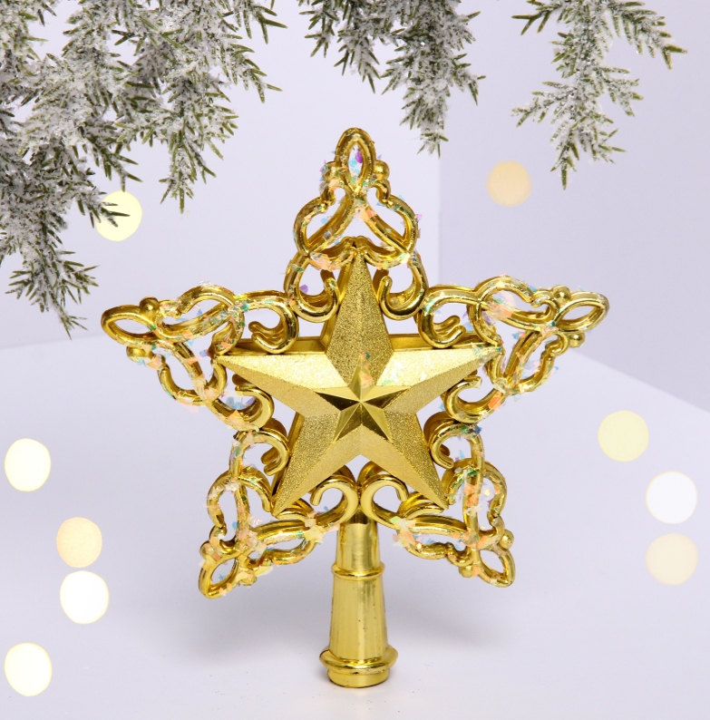 Изысканная золотая звезда с эффектом инея добавит благородного сияния и тепла. Преимущества и свойства: идеальное завершение новогодней композиции, яркий блеск, надежное крепление, прочный материал.